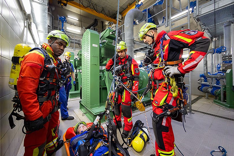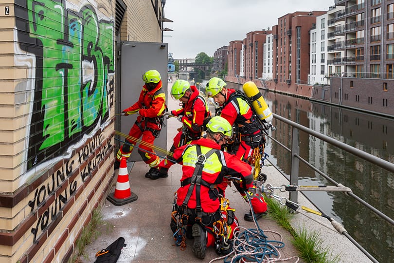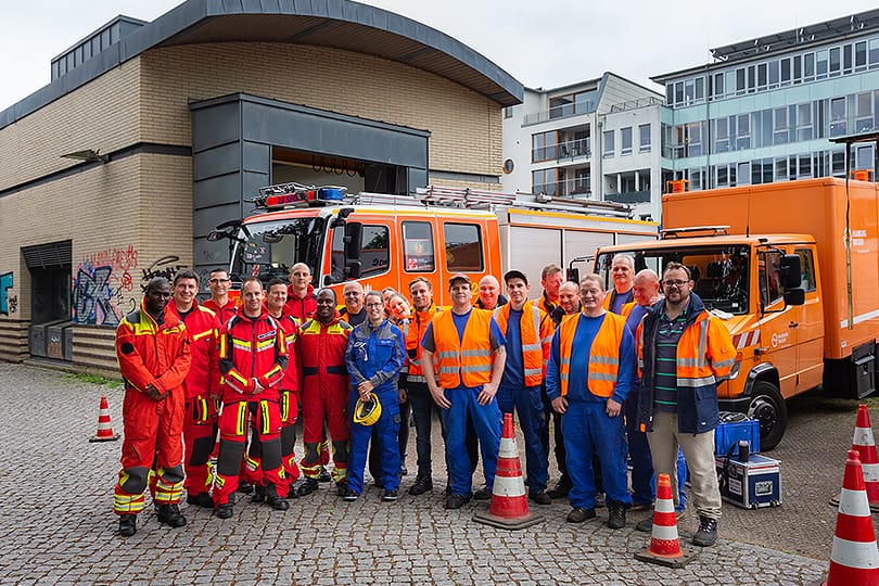 2019 führten Mitarbeitende von HAMBURG WASSER mit der Feuerwehr aus Tansania ein Höhensicherungstraining in Hamburg durch. Inhalte waren das Einsteigen und Arbeiten unter Pressluftatmung und in 20 Meter tiefe Abwasserkanäle.